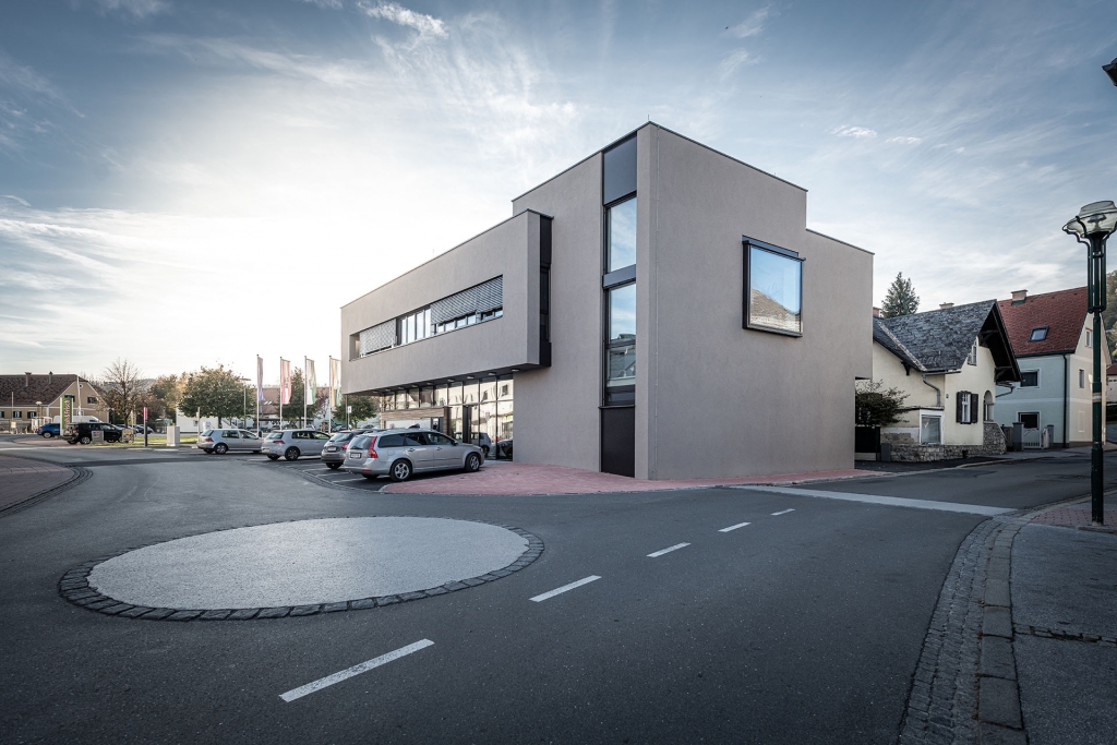 Das neue Gemeindeamt der Marktgemeinde Maria Lankowitz wurde als Ersatz für einen leerstehenden, desolaten Altbau in zentraler Lage an der Hauptstraßenkreuzung angrenzend zum Schlossplatz errichtet. Die beengten Platzverhältnisse erforderten eine platzsparende Lösung insbesondere, da aus ortsplanerischen Gründen auf mehr als 2 Geschosse verzichtet werden sollte. Die Baukörperstellung und die architektonische Ausformung reagiert auf die örtlichen Verhältnisse. Es wurde eine klare architektonische Formensprache umgesetzt, wobei der Baukörper im Kreuzungsbereich unaufgeregt geradlinig und selbstbewusst in Erscheinung tritt und sich zur Weite des Schlossplatzes hin öffnet. Das erforderliche Raumprogramm wurde auf ein Minimum reduziert und der zur Verfügung gestandene Raum wurde bis auf den letzten m2 ausgenutzt. Es finden alle Funktionen auf ca. 400 m2 Nutzfläche Platz, was vergleichsweise eine sehr sparsame Fläche für ein modernes Gemeindeamt in einer Marktgemeinde darstellt. Die Funktionsabläufe wurden in enger Abstimmung mit den Gemeindevertretern entwickelt und so möglichst funktionell umgesetzt. Das Objekt beherbergt im Erdgeschoß das Bürgerservice mit vorgeschaltetem Foyer sowie einem Sitzungssaal der auch als Trauungssaal dient. Der Trauungs- und Sitzungssaal orientiert sich zum Schloss hin und weist eine dem Schlossplatz vorgelagerte Terrasse auf. Im Obergeschoß sind die einzelnen Büros für Buchhaltung, Bauamt, Bürgermeister etc. inkl. Archiv- und Sozialräumlichkeiten untergebracht. Über ein auskragendes Panoramafenster gelangt dort ausreichend Licht in den zentralen Mittelgang. Die interne Treppenerschließung wurde an der Kreuzungsecke situiert und folgt damit dem regen äußeren Verkehrsverlauf.